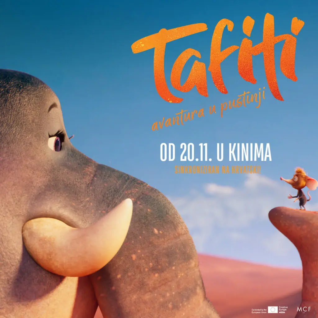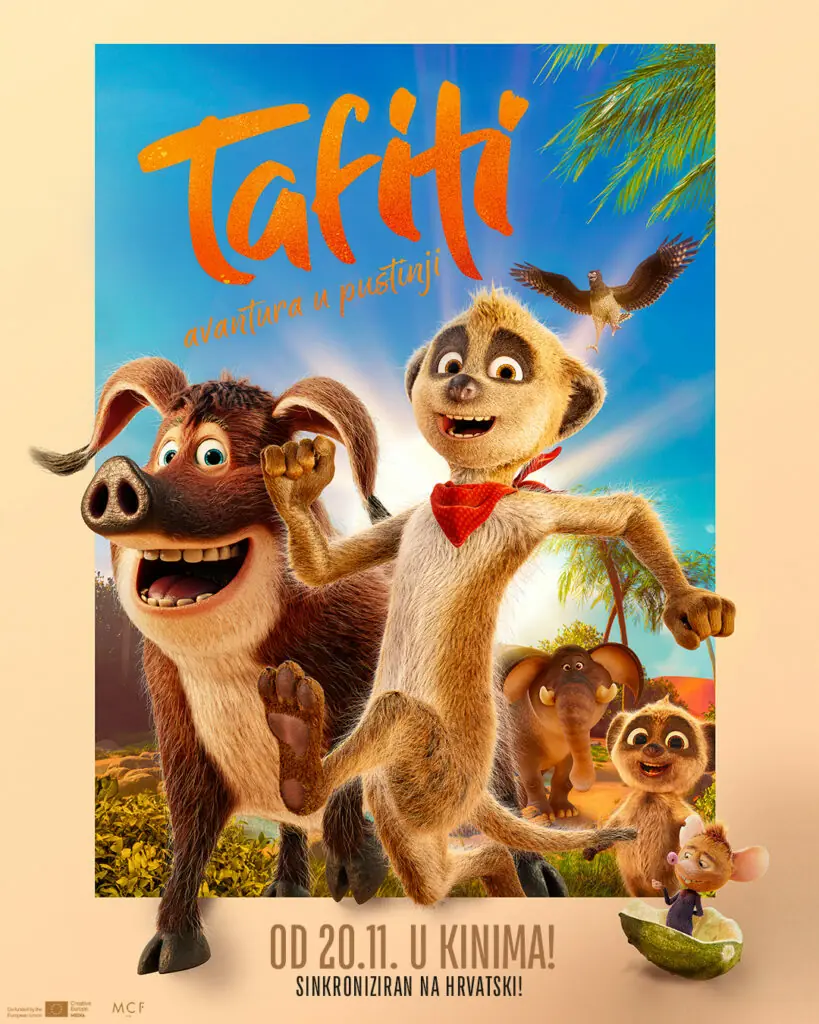 Nakon svjetske premijere na festivalu u Münchenu, u kina stiže super zabavna animirana poslastica za sve generacije gledatelja – TAFITI: AVANTURA U PUSTINJI! Riječ je o dugometražnom animiranom filmu njemačke produkcije koji će se u našim kinima, naravno, prikazati u sinkroniziranoj verziji, a koji je snimljen prema mega popularnom dječjem književnom serijalu „Tafiti“ autorice Julije Boehme. Prvu knjigu izdala je poznata njemačka izdavačka kuća Loewe, a malo je reći da je od tada serijal postao iznimno čitanim i to do te mjere da su se producenti odlučiti za filmsku adaptaciju upravo jedne od prvih knjiga iz serijala. Animirani film TAFITI: AVANTURA U PUSTINJI u hrvatskim će se kinima započeti prikazivati od 20. studenog u sinkroniziranoj verziji u kojoj su glasove, među ostalima, posudili Ivan Mokrović, Goran Vrbanić, Daniel Dizdar, Dora Jakobović, Karlo Mrkša, Teon Pavišić i Sandra Hrenar Matić. Priča filma prati mladog merkata Tafitija koji je upravo upoznao divlju svinju Čupka, ali mu odmah postaje jasno da njih dvojica neće moći postati prijatelji. „Merkati se drže svoje vrste“, oduvijek mu je govorio djed, budući je život u pustinji prepun opasnosti. No, kad Čupka napadne orao, upravo će Tafiti biti taj koji će mu priskočiti u pomoć. Očajnički u potrazi za novim prijateljem, simpatična i uvijek za igru spremna divlja svinja Čupko otpratit će Tafitija do njegove kuće te nenamjerno uzrokovati nesretan incident – Tafitijevog djeda ugrist će otrovna zmija, a jedino što ga može spasiti je mitski plavi pustinjski cvijet. Tafiti će se tako upustiti na opasno putovanje u potrazi za cvijetom, uvjeren da to mora učiniti sam. A na Čupku ostaje da mu dokaže da su avanture uvijek bolje uz prave prijatelje! Animirani film TAFITI: AVANTURA U PUSTINJI prava je zabavna obiteljska komedija koja će razveseliti baš sve generacije gledatelja, a u domaća kina stiže od četvrtka, 20. studenog.